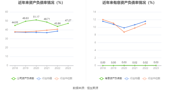 在偿债能力方面,公司2023年年末资产负债率为47.27%,相比上年末上升3.41个百分点;有息资产负债率为0.03%,相比上年末上升0.01个百分点。