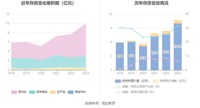 从存货变动来看,截至2023年年末,公司存货账面价值为10.02亿元,占净资产的31.69%,较上年末增加2.3亿元。其中,存货跌价准备为6830.35万元,计提比例为6.38%。