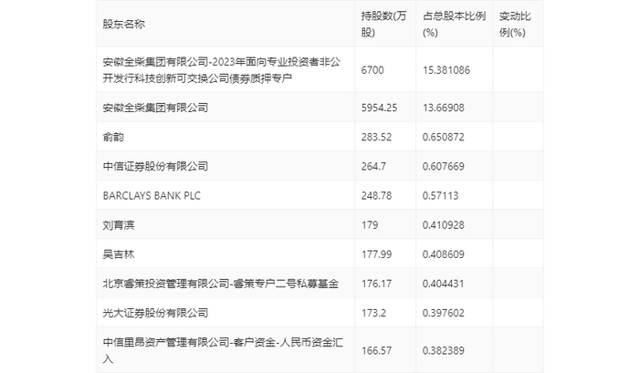 年报显示,2023年年末公司十大流通股东中,新进股东为安徽全柴集团有限公司-2023年面向专业投资者非公开发行科技创新可交换公司债券质押专户、中信证券股份有限公司、BARCLAYS BANK PLC、北京睿策投资管理有限公司-睿策专户二号私募基金、光大证券股份有限公司、中信里昂资产管理有限公司-客户资金-人民币资金汇入,取代了三季度末的光大保德信量化核心证券投资基金、徐开东、陈国谦、国金量化多因子股票型证券投资基金、胡玉枚、国泰君安量化选股混合型发起式证券投资基金。在具体持股比例上,吴吉林持股有所上升,安徽全柴集团有限公司持股有所下降。