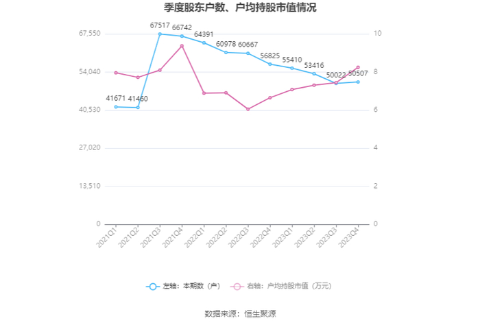 筹码集中度方面,截至2023年年末,公司股东总户数为5.05万户,较三季度末增长了485户,增幅0.97%;户均持股市值由三季度末的7.44万元上升至8.25万元,增幅为10.89%。