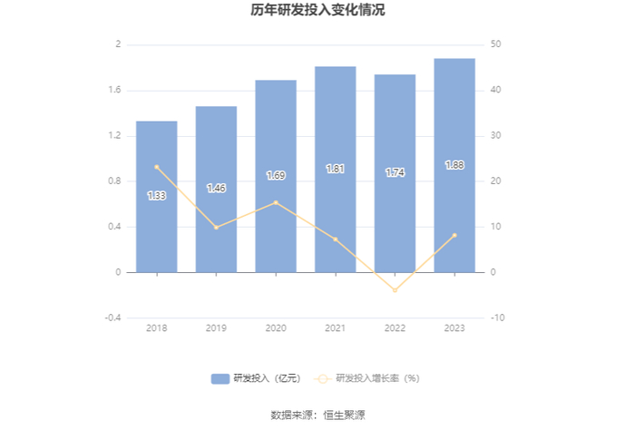 2023年全年,公司研发投入金额为1.88亿元,同比增长8.20%;研发投入占营业收入比例为3.91%,相比上年同期上升0.38个百分点。此外,公司全年研发投入资本化率为0。