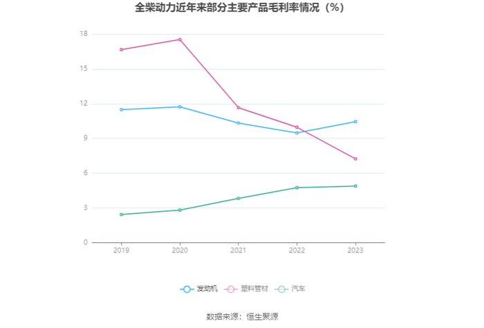 分产品看,发动机、塑料管材、汽车2023年毛利率分别为10.45%、7.24%、4.89%。
