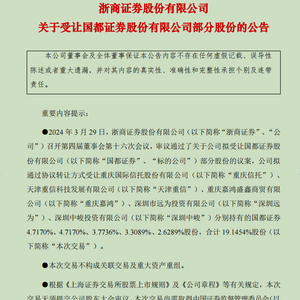 终于定了!国都证券第一大股东将变更,浙商证券受让19%股份,标的转让价格2.673元/股