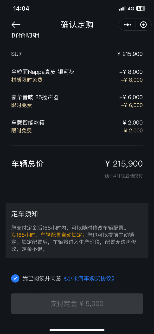 但小米在SU7上重新定义了“大定”,给出了定金7日可退的政策,并且小米将锁单的权利下放给了用户。这也导致了部分用户在快速操作时,直接锁单,造成了订金不可退的情况。