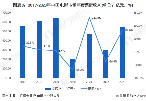 从电影票房收入来看,从电影票房收入来看,2016-2019年,中国电影票房收入持续增长,并成功突破600亿大关。2019年,我国票房收入达641亿元,较2018年增长5.4%,增速整体呈现下滑态势。2020年,受新冠疫情影响,我国电影票房收入仅为203亿元,不到2019年票房收入的三成。2023年中国电影票房相比2020-2022年三年大幅上涨,已经恢复至2017年水平。。