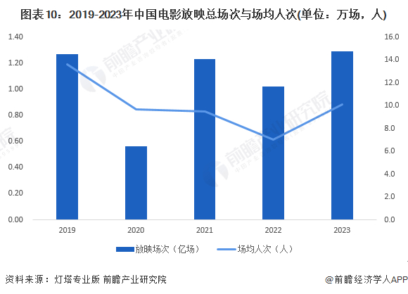 2019-2022年,我国电影放映规模逐年下降。2023年全国电影放映规模超过2019年历史最高水水平,场均人次2019年后首度回升,达到10.1人。