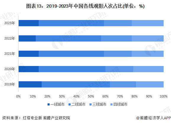 2023年四线城市观影人次市场份额为22%,三线城市观影人次市场份额有所下降,下沉市场观众占比连续四年保持在全国40%以上。