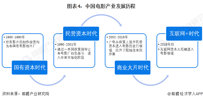 从1950年发展至今,我国电影行业共经历了四个阶段,分别为“国有资本时代”、“民营资本时代”、“商业大片时代”和目前所处的“互联网+时代”。