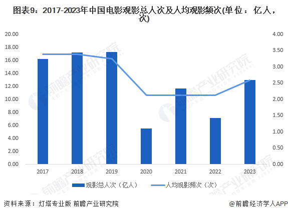 从观影人次的变动情况看,2016-2019年,国内观影人次不断增长,但增速逐渐放缓。2019年全国电影观影人次为17.3亿人,与2018年基本持平。2020年受疫情影响,中国观影人次出现断崖式下跌,仅为5.5亿人,较2019年下降近68.21%。2023年中国电影观影人次大幅上涨六成,人均观影频次上升至2.58次。