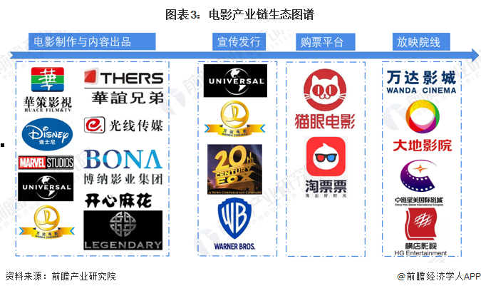 电影制作方主要包括国内外文学与剧本等原始作品方,如国外的漫威、迪士尼,国内的华策影视、腾讯文学等;内容出品方包括海外的华纳兄弟、环球影业,国内的万达影视、华谊兄弟等专业影视公司;宣传发行方包括华纳兄弟、环球影业等传统影视公司发行方,以及淘票票、爱奇艺与猫眼电影等网络发行方;电影产业链终端的院线平台代表公司有海外的AMC与国内的万达影院、大地影院、横店影视等。