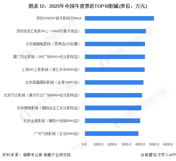 2023年票房TOP10影院中,北京占5席,深圳|2席,广州1席。其中,深圳CINESKYU新天影院双IMAX影院年度总票房达到4957.9万元,排名第一。