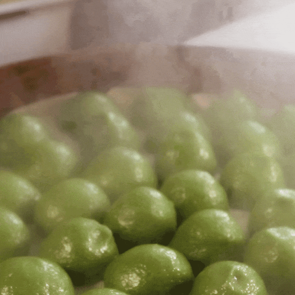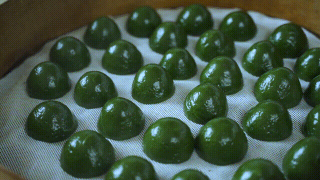 等待青团从草绿色变成圆润饱满的翠绿碧玉,色泽鲜亮,油光闪闪惹人爱。
