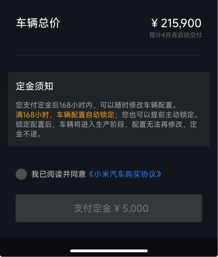对于部分人的无法退定,小米方面回应称:定金7日内支持无理由退款,超过7日后,车辆配置会自动锁定,消费者也可以提前主动锁定配置的。一旦订单锁定,车辆将进入生产阶段,配置无法再修改,定金不退。此外创始版现车配置已经锁定,消费者在支付2万元定金后,即锁单。