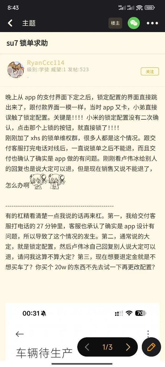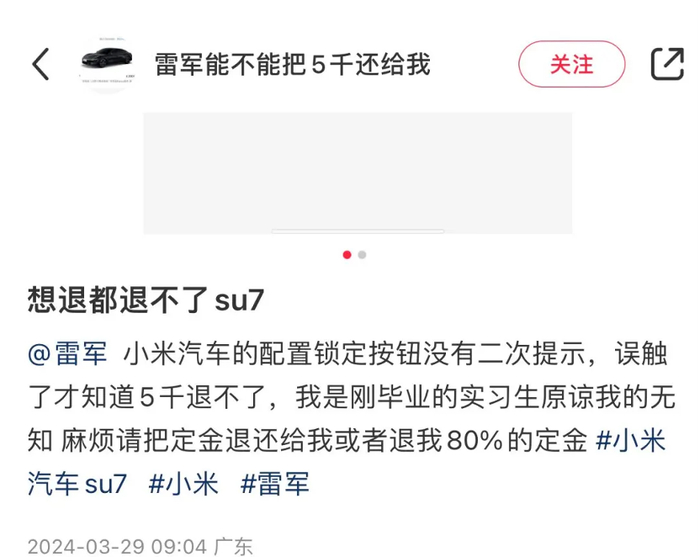 还有一名叫“雷军能不能把5千还给我”的用户,自称刚毕业实习生的网友表示:小米汽车的配置锁定按钮没有二次提示,误触了才知道5千退不了,我是刚毕业的实习生原谅我的无知,麻烦请把定金退还给我或者退我80%的定金。