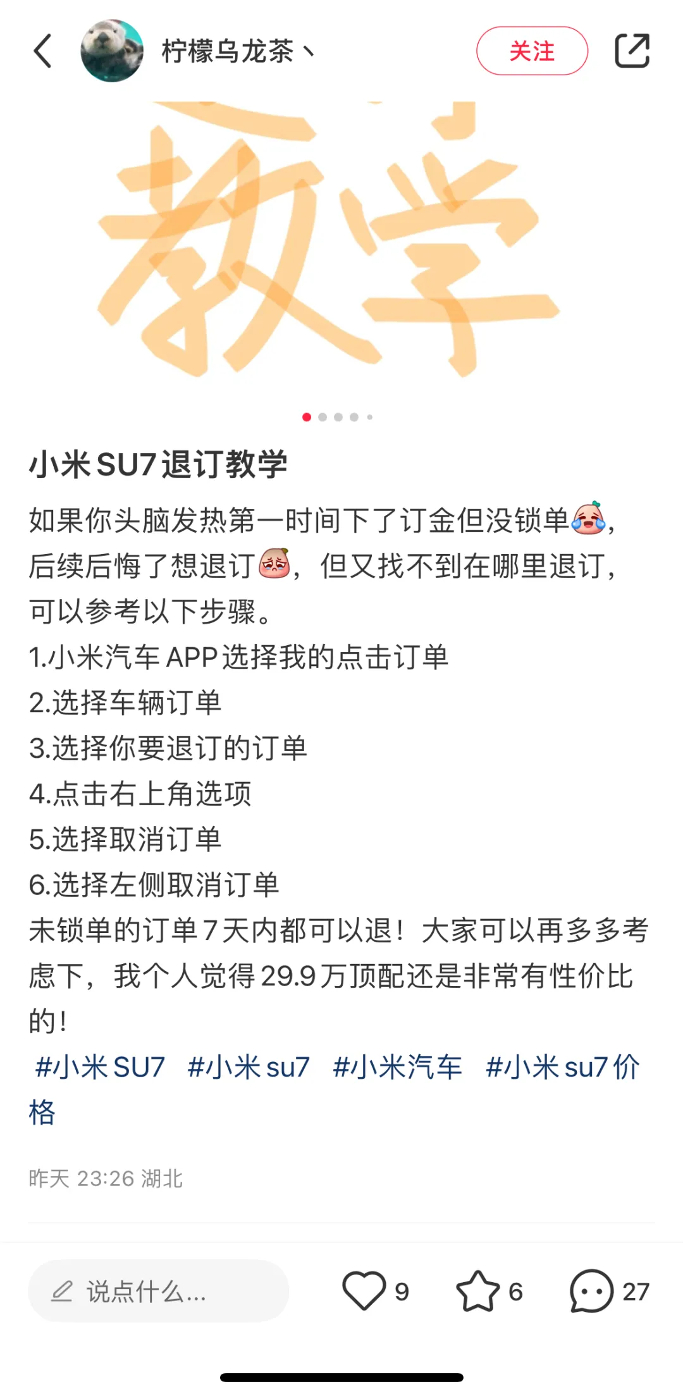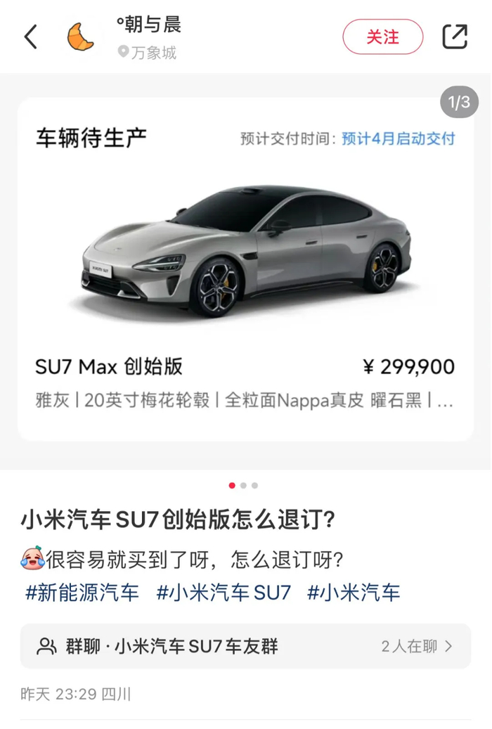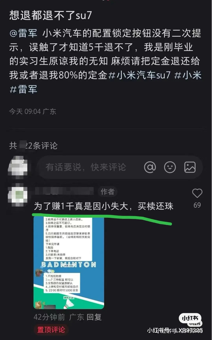 笑喷,本想用小米SU7订单装个X,5千定金却退不了了