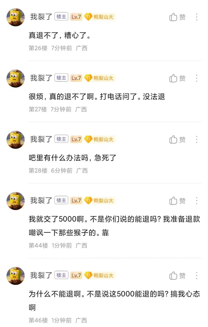 有人甚至组建了维权群,抱团取暖,寻求退定方法。
