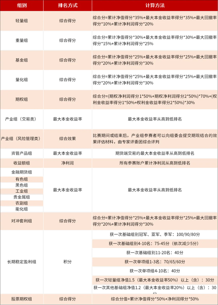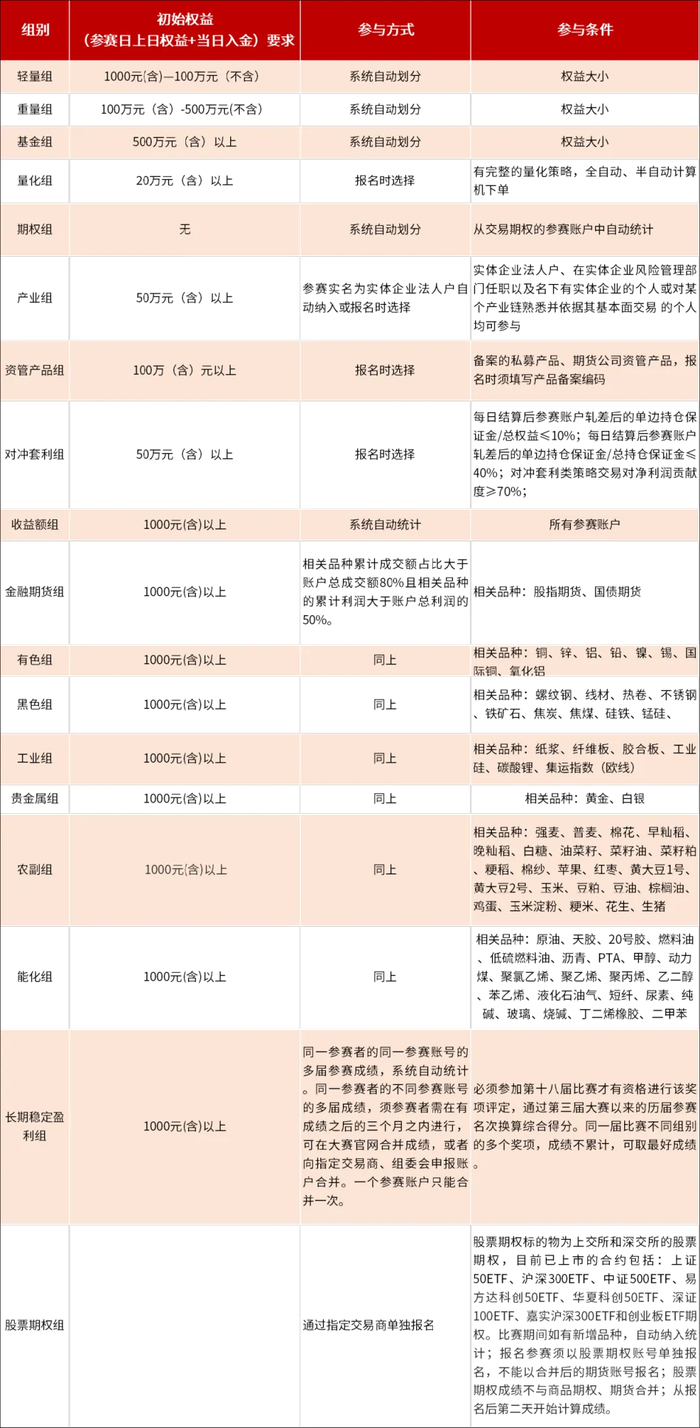 3.参赛者所在的基础组别根据权益、交易品种及出入金情况自动划分和调整,具体如下:(参赛当日的上日权益+累计净出入金)及日均可用权益<100万元,调整为轻量组;100万元(含)<(参赛当日的上日权益+累计净出入金)及日均可用权益<500万元(不含),调整为重量组;500万元(含)<(参赛当日的上日权益+累计净出入金)及日均可用权益,调整为基金组。组别调整之后,成绩继续保留。