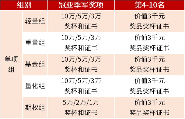 7.比赛结束后,轻量组累计净值大于等于1.5或者最大本金收益率大于等于50%,重量组、基金组、量化组累计净值大于等于1.2或者最大本金收益率大于等于20%的账户,均可获得“优秀奖”荣誉证书。期权组排名前50名,且有期权交易的天数不低于10天,可获得“优秀奖”荣誉证书。资管能力评级三星以上者可获得“优秀奖”荣誉证书。
