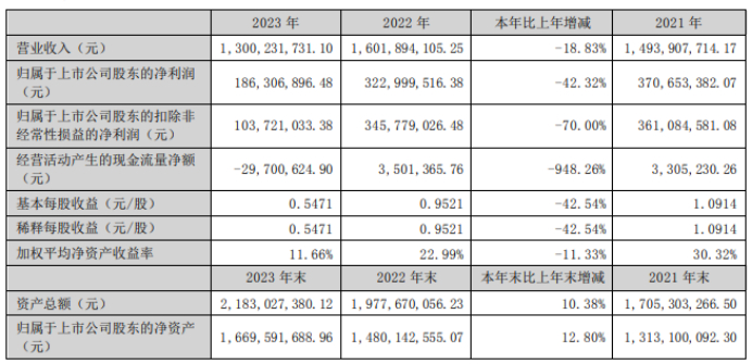 挖贝网3月30日,中颖电子 近日发布2023年年度报告,报告期内公司实现营业收入1,300,231,731.10元,同比下滑18.83%;归属于上市公司股东的净利润186,306,896.48元,同比下滑42.32%。