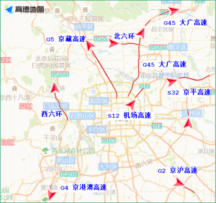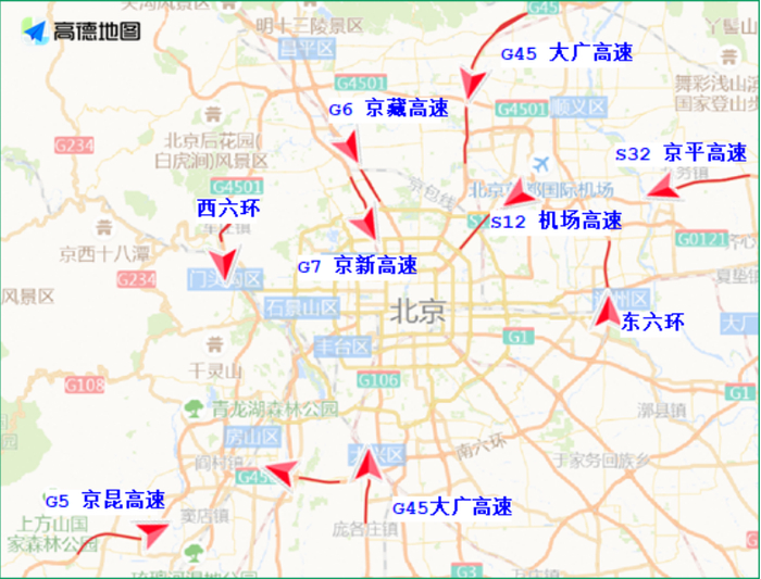 路段方面,京藏高速八达岭至居庸关、西关出口,京承高速望和桥至酸枣岭桥,京港澳高速杜家坎、长阳路段,京开高速榆垡、玉泉营等路段通行压力较大;望和桥、健翔桥、来广营桥、箭亭桥等环路和高速公路相交的桥区节点也容易出现因车流量大引发的通行不畅情况。