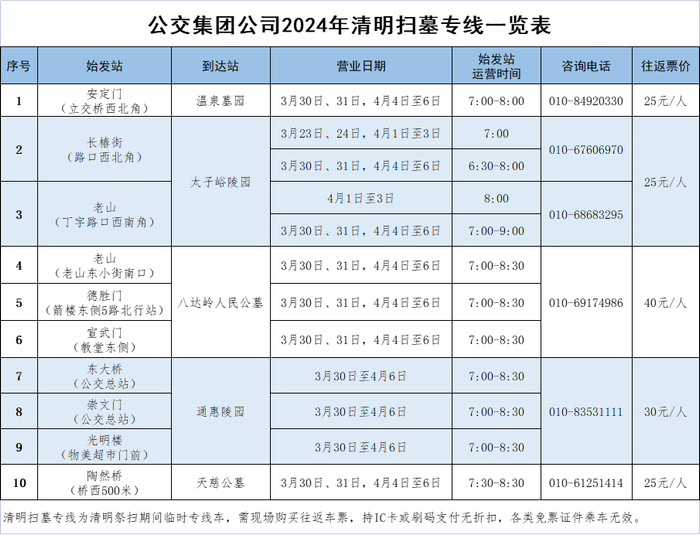 为保障市民出行,地面公交开通由市区直达太子峪陵园、通惠陵园、温泉墓园、天慈公墓、八达岭人民公墓等5个陵园墓地的10条扫墓专线,并配备充足运力。