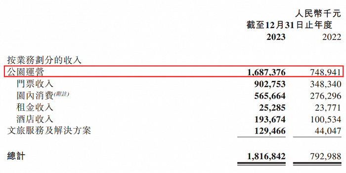 【公园运营】收入包含“门票收入”“园内消费”“租金收入”以及“酒店收入”,占比分别为53.5%、33.5%、1.5%、11.5%(占公园运营部分收入)。