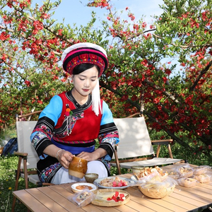 身着白族服饰的“金花”在木瓜园中为游客准备茶饮和特色美食(摄于3月26日)。新华网发(赵勇 摄)