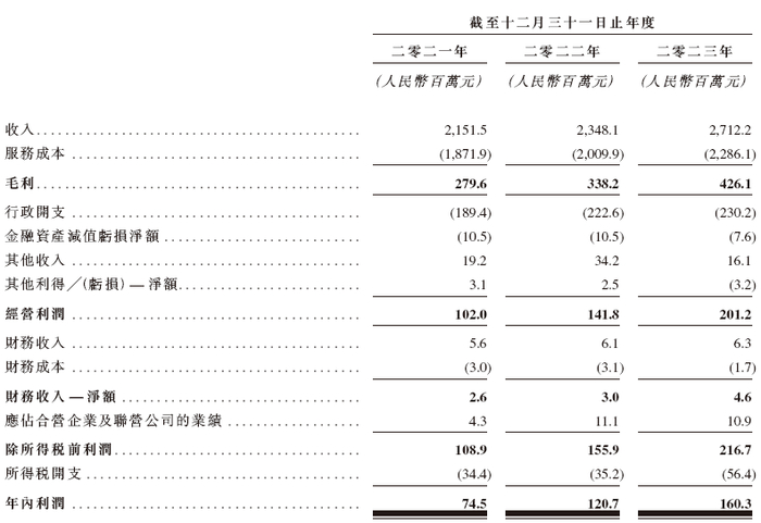 招股书显示,在过去的2021年、2022年和2023年,深业物业的营业收入分别为人民币21.52亿、23.48亿和27.12亿元,相应的净利润分别为人民币0.75亿、1.21亿和1.60亿元。