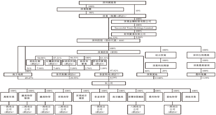 深圳国资委通过全资子公司深业(集团)持股63.19%的深圳控股(00604.HK)间接控制,其中: