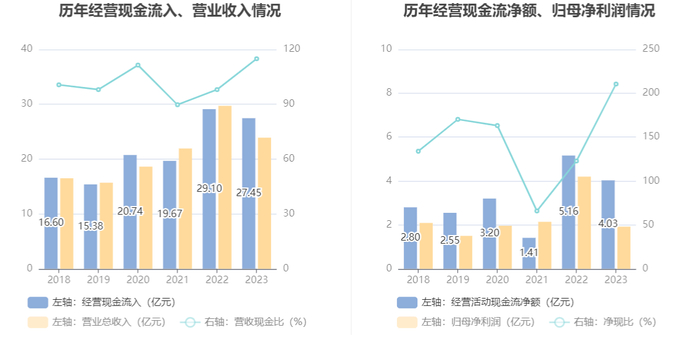 2023年,公司营业收入现金比为114.86%,净现比为210.47%。