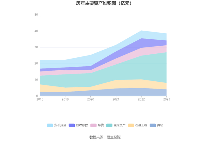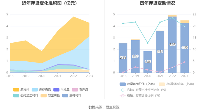 从存货变动来看,截至2023年年末,公司存货账面价值为4.3亿元,占净资产的19.85%,较上年末减少5446.19万元。其中,存货跌价准备为2079.45万元,计提比例为4.62%。