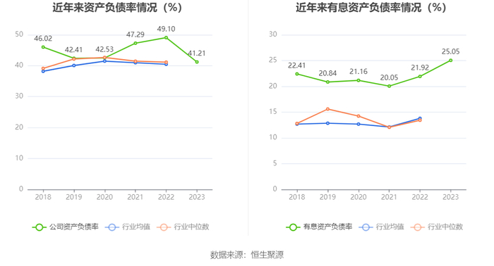 在偿债能力方面,公司2023年年末资产负债率为41.21%,相比上年末下降7.89个百分点;有息资产负债率为25.05%,相比上年末上升3.13个百分点。