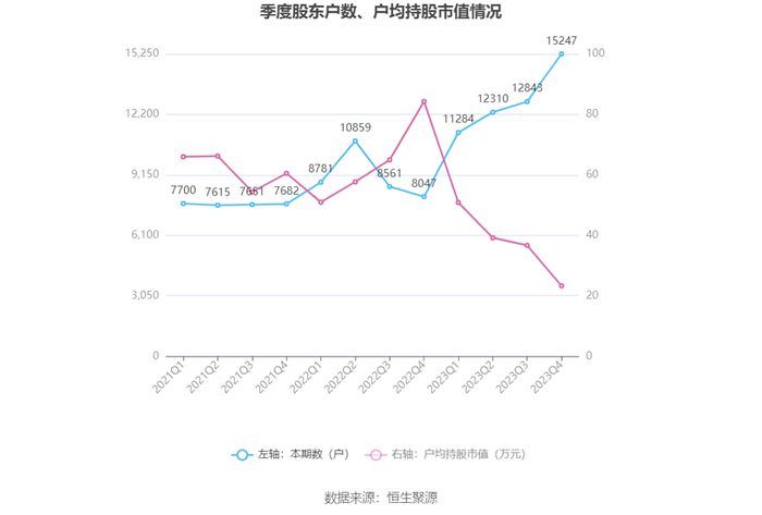 筹码集中度方面,截至2023年年末,公司股东总户数为1.52万户,较三季度末增长了2404户,增幅18.72%;户均持股市值由三季度末的36.69万元下降至23.29万元,降幅为36.52%。