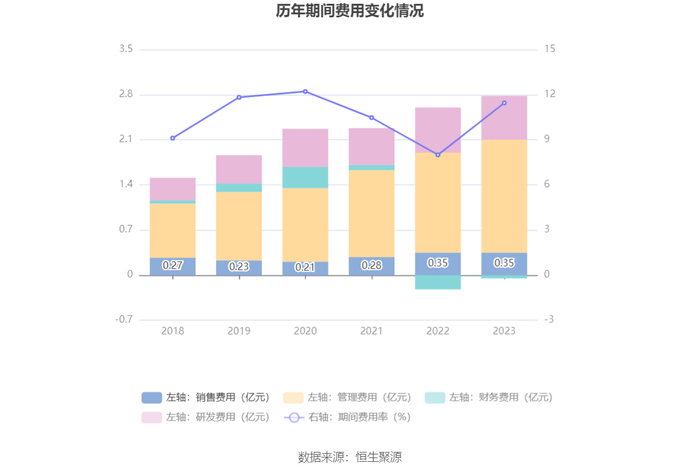 2023年,公司期间费用为2.74亿元,较上年同期增加3609.45万元;期间费用率为11.45%,较上年同期上升3.45个百分点。其中,销售费用同比增长0.25%,管理费用同比增长13.52%,研发费用同比下降3.23%,财务费用由去年同期的-2238.37万元变为-500.77万元。