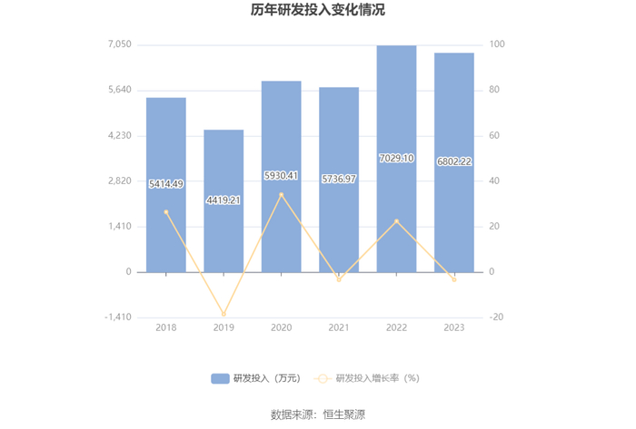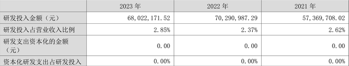 2023年全年,公司研发投入金额为6802.22万元,同比下降3.23%;研发投入占营业收入比例为2.85%,相比上年同期上升0.48个百分点。此外,公司全年研发投入资本化率为0。