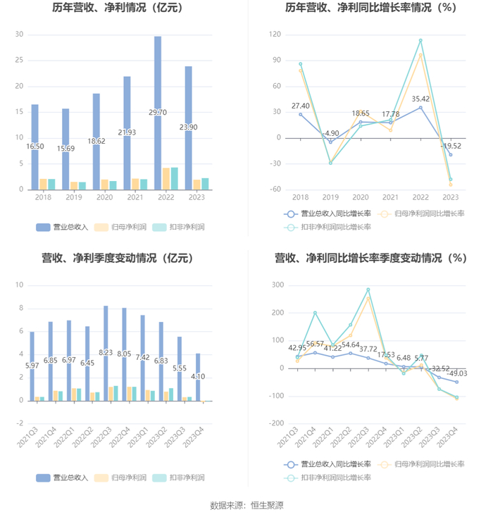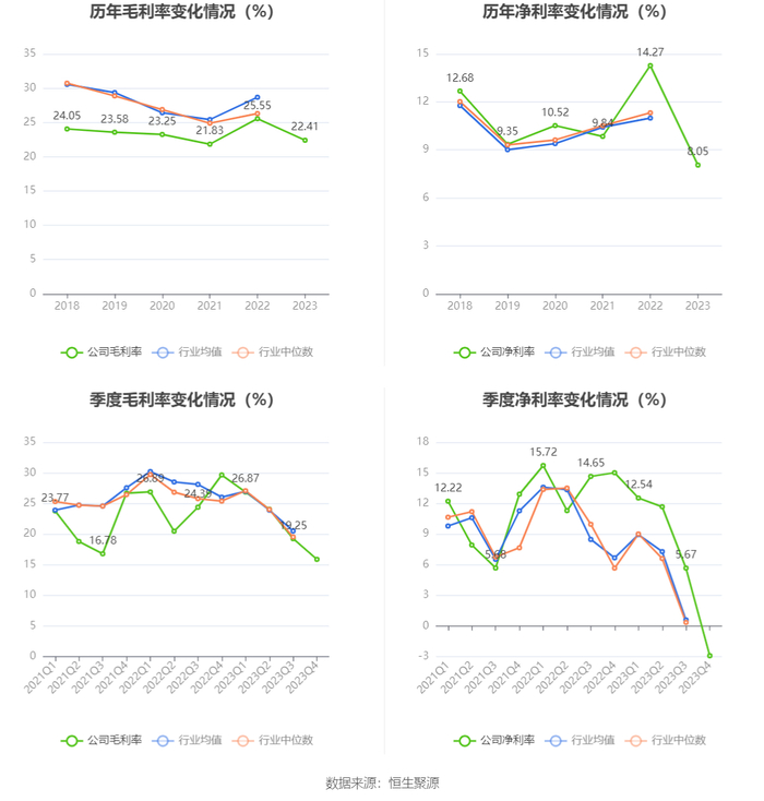 2023年,公司毛利率为22.41%,同比下降3.14个百分点;净利率为8.05%,较上年同期下降6.22个百分点。从单季度指标来看,2023年第四季度公司毛利率为15.88%,同比下降13.77个百分点,环比下降3.37个百分点;净利率为-2.91%,较上年同期下降17.92个百分点,较上一季度下降8.58个百分点。