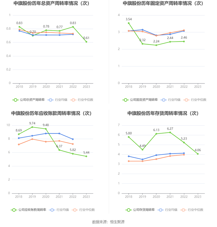 营运能力方面,2023年,公司公司总资产周转率为0.61次,上年同期为0.83次(2022年行业平均值为0.72次,公司位居同行业11/32);公司应收账款周转率、存货周转率分别为5.44次、4.06次。