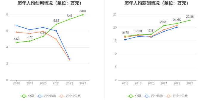 截至2023年末,公司员工总数为4302人,人均创收55.53万元,人均创利8.00万元,人均薪酬22.86万元,较上年同期分别增长13.42%、7.63%、5.56%。