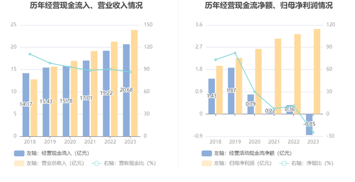 2023年,公司营业收入现金比为86.59%,净现比为-24.70%。