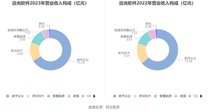 分产品来看,2023年公司主营业务中,数字企业收入15.75亿元,同比增长16.14%,占营业收入的65.94%;前沿技术收入3.49亿元,同比增长3.35%,占营业收入的14.59%;智慧能源收入2.92亿元,同比增长10.99%,占营业收入的12.21%。