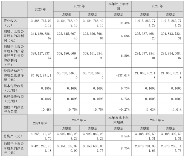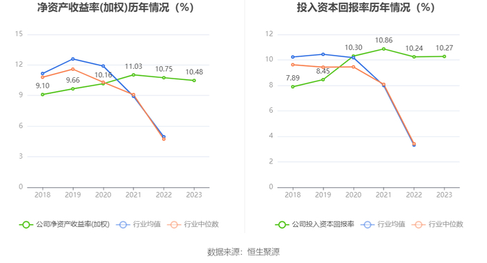 数据显示,2023年公司加权平均净资产收益率为10.48%,较上年同期下降0.27个百分点;公司2023年投入资本回报率为10.27%,较上年同期增长0.03个百分点。