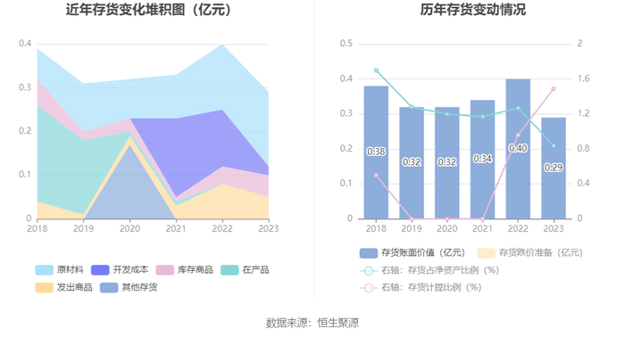 从存货变动来看,截至2023年年末,公司存货账面价值为2889.1万元,占净资产的0.84%,较上年末减少1103.45万元。其中,存货跌价准备为43.74万元,计提比例为1.49%。