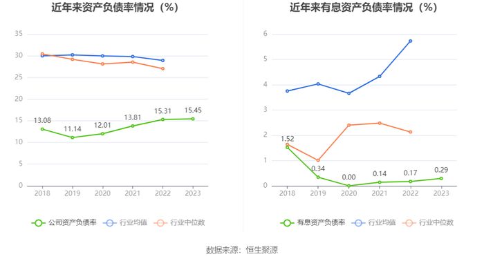 在偿债能力方面,公司2023年年末资产负债率为15.45%,相比上年末上升0.14个百分点;有息资产负债率为0.29%,相比上年末上升0.12个百分点。