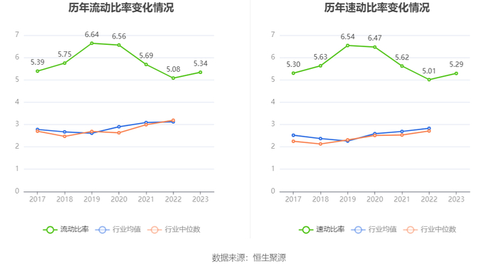 2023年,公司流动比率为5.34,速动比率为5.29。