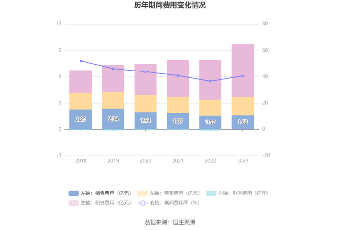 2023年,公司期间费用为9.71亿元,较上年同期增加1.92亿元;期间费用率为40.65%,较上年同期上升3.99个百分点。其中,销售费用同比增长2.9%,管理费用同比增长14.79%,研发费用同比增长32.65%,财务费用由去年同期的-1222.09万元变为67.59万元。