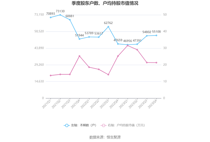 筹码集中度方面,截至2023年年末,公司股东总户数为5.51万户,较三季度末增长了306户,增幅0.56%;户均持股市值由三季度末的21.41万元下降至21.36万元,降幅为0.23%。