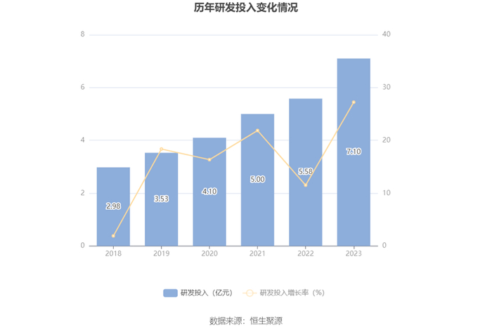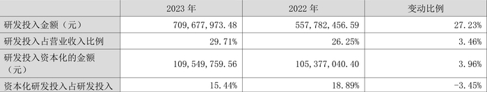 2023年全年,公司研发投入金额为7.10亿元,同比增长27.23%;研发投入占营业收入比例为29.71%,相比上年同期上升3.46个百分点。此外,公司全年研发投入资本化率为15.44%。