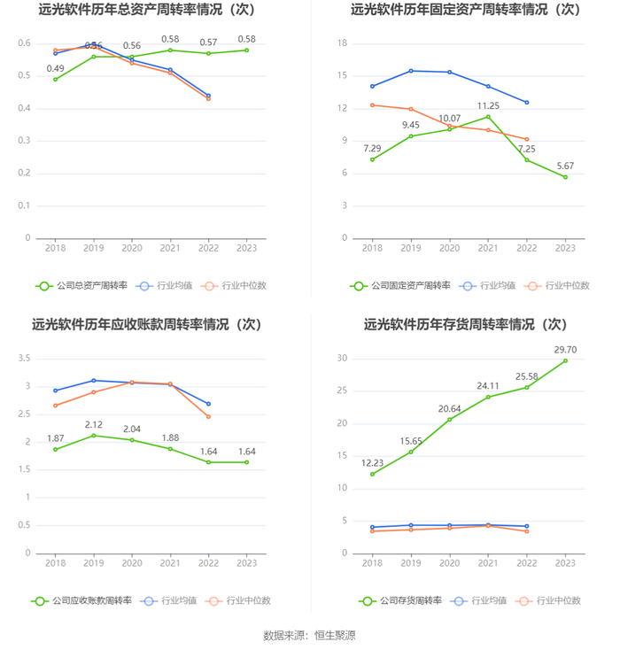 营运能力方面,2023年,公司公司总资产周转率为0.58次,上年同期为0.57次(2022年行业平均值为0.44次,公司位居同行业35/103);固定资产周转率为5.67次,上年同期为7.25次(2022年行业平均值为12.57次,公司位居同行业60/103);公司应收账款周转率、存货周转率分别为1.64次、29.70次。