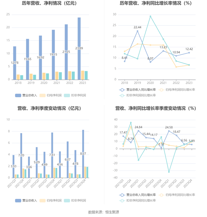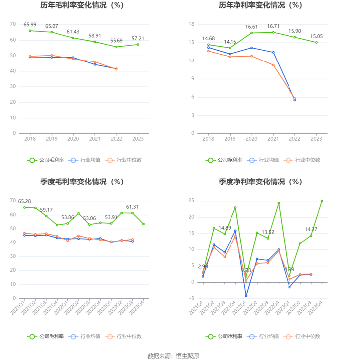 2023年,公司毛利率为57.21%,同比上升1.52个百分点;净利率为15.05%,较上年同期下降0.85个百分点。从单季度指标来看,2023年第四季度公司毛利率为53.48%,同比下降0.92个百分点,环比下降7.83个百分点;净利率为24.98%,较上年同期上升0.63个百分点,较上一季度上升10.61个百分点。