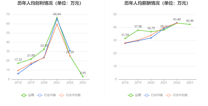 截至2023年末,公司员工总数为779人,人均创收214.76万元,人均创利2.95万元,人均薪酬42.46万元,较上年同期分别变化17.87%、-88.39%、-2.17%。